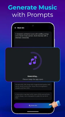 Do you want to create original music? Simply describe the music style and vibe in text, and our AI-powered music generator will compose a unique track for you. No instruments needed—just your imagination!