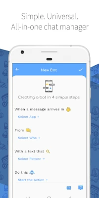 Auto send messages with images, connect your chats to your Google Sheets or cloud, Monitor chat groups for topics and follow specific friends, turn messages into tasks, notes and reminders all from within your favorite social messenger app.