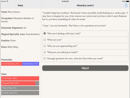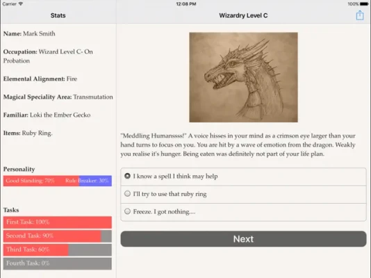 • Choose your name, gender, elemental alignment and area of magical focus. • Explore worlds both on and off Earth, full of magical creatures. • Track your standing with the wizardry guild and your success in completing the tasks they set. • Good replayablity with branching story lines and over 19 different endings. • Hints section. • Save points allowing replay some sections without having to restart the story from the beginning. • And well....who wouldn't want to be a wizard?