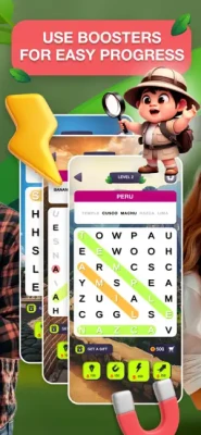 Get ready to explore a world packed into word puzzles where learning meets fun! In Wordscapes. Word Search, every level is designed not only to challenge your vocabulary but also to expand your knowledge about countries of our globe. Discover new words and facts of various countries as you progress through the game.