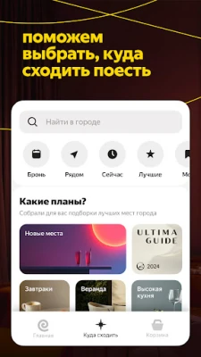 Исследуйте мир гастрономии вместе с гидом Яндекс Еды — новый сценарий помогает выбрать, куда сходить поесть, и будет особенно полезен, если вы оказались, например, в новом городе. В гиде вы найдете рекомендательную ленту выдачи ресторанов, подборки, десятки разнообразных фильтров, которые помогут сузить список ресторанов под ваш вкус и ситуацию. Все лучшие рестораны у вас в телефоне, пара кликов — и вы уже звоните в ресторан бронировать столик