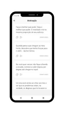 You have access to over 10,000 quotes for status to create your videos with quotes. The quotes are divided into more than 20 categories, including motivational, life, maloka, good morning, love, reflection, and much more.