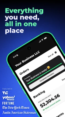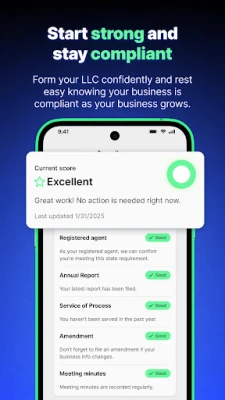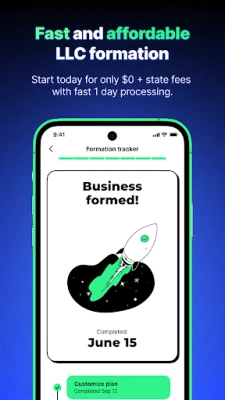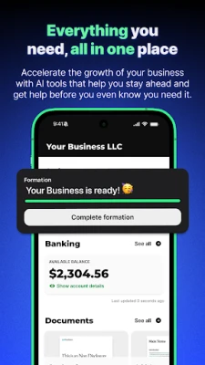 Whether you're forming your first LLC, organizing your side hustle, or scaling an existing business, the mobile app gives you the tools and peace of mind you need to succeed. Start strong and accelerate the growth of your business with AI tools that help you stay ahead and get help before you even know you need it.