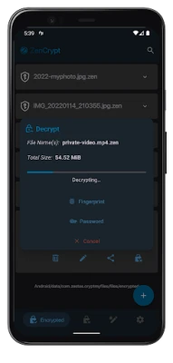 A: ZenCrypt supports encrypting using an alphanumerical password, or using a fingerprint, if your device supports it.