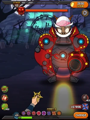 Zombie boss leads mob of zombies come to you to invade Ninja homeland. Yes, YOU, as a brave and agile ninja, have to shoot shurikens (darts) or bombs to destroy hundreds and thousands of different kinds of zombies before they break down your homeland!
