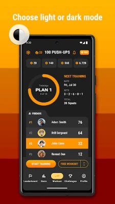 A scientifically developed training plan guides you toward your goal, always keeping your fitness level in mind. You can choose between three levels from 0 to 100 Push-Ups.