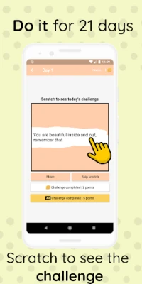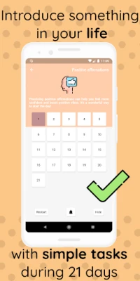 Starting a healthy lifestyle, taking a break away from the internet, practicing gratitude, learning a new language, trying to be more productive, finding happiness, self-help, how to study effectively, ways to spread kindness and positivity, tips for fixing your sleeping schedule, self-care practices, decluttering, being more confident, writing journal prompts and daily positive affirmations are some of the challenges that you can find in the app.