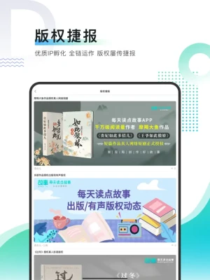 每天读点故事APP坚持“原生、奇崛、动人”的内容主张,注重”故事创作素材“的原生性、“情理之中意料之外“的戏剧性、“能触动人”的情绪关联性,内容主打女性悬疑惊悚、现实情感、浪漫言情、国风幻想、职业故事等类型化文学。【短剧】每天读点故事APP自2021年以来着重在短剧赛道发力,与多家头部影视公司合作并开辟短剧、微短剧多种体量合作模式,已成功授权独家签约作品《情难自控》、《悬溺》、《胭脂围城》、《匿名短信》、《初恋物语:爱在屋檐下》等数十部作品进行短剧开发,其中由《情难自控》改编快手短剧《前方高能》平台播放量超3亿次。【电影】平台凭借在现实、悬疑、幻想等类型内容方向的深耕,以及中短篇文学作品改编电影的天然优势和大量储备。和国内知名导演、制片以及电影公司积极建立合作,目前已成功授权《无畏布施》、《赛博神话:祸乱时期的爱情》、《行者》、《过冬》、《行镖》、《奇物志:日抛脸》、《超完美杀人案》、《大话西游之八十二难》等多部独家签约作品进行电影开发。【出版】读点APP已与多家出版文化公司和出版社达成合作,已成功授权《她从梦里来》《京城情报司》《影帝他总想对我图谋不轨》《宇宙留言》《羲河传》《神探太子妃》《凡人笔谈》《风水师报君知》《裁员专家》等数十部独家签约类型作品进行实体书出版,其中《愿所有的姑娘都能嫁给爱情》是由读点APP和出版方联合征文的获奖作品集结成书。【网剧】平台积极探索类型小说的影视化可能,与业内多家影视公司达成合作,已成功授权《徙鸟迷途》《前夫的前妻》《裁员专家》《世界末日的那一年》《拜见仙君大人》《影帝他总想对我图谋不轨》《神探太子妃》《天增顺》等数十部独家签约类型作品进行真人网剧改编。