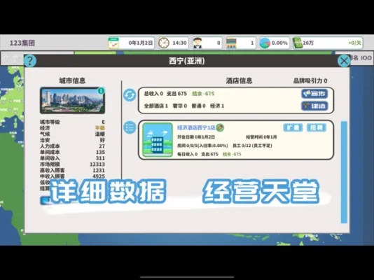 单机酒店大亨养成游戏来了!环球酒店大亨打破现在各种游戏的常规设定,主界面就是世界地图,国际酒店行业的一举一动,尽在你的掌控范围之内!在你的带领下,你的酒店集团能从无星、一星......一步步爬上七星吗?