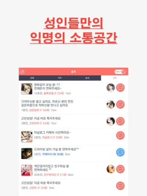 - 관심사항이나 이성만남의 토크를 등록하면 주변에서 토크내용을 보고 쪽지를 통해 채팅을 할 수 있습니다.
