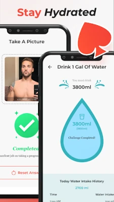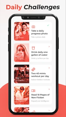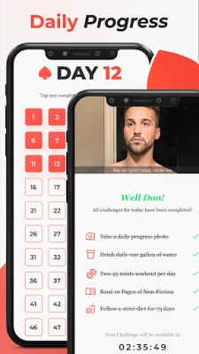 Complete key daily tasks such as workouts, meals, water intake, reading time, and progress photos. Stay on track with clear daily goals.