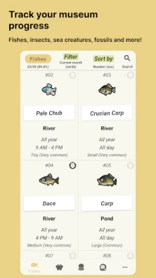 Learn how to obtain and track: - Fishes - Insects - Sea creatures - Fossils - Art - Music - Flowers - Reactions