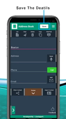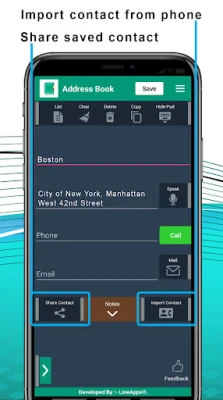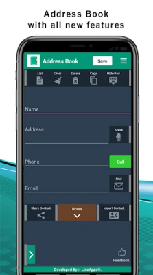 * Manually add new name, address (manually or speak to add), phone/ contact numbers and email-id.