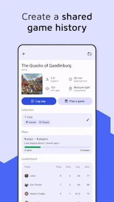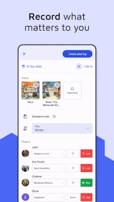 Record a shared log for every tabletop game you play, keeping a comprehensive record of victories, strategies, and memorable moments. The record appears in each players’ account.