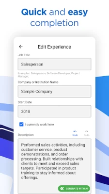 Download AI Resume Builder CV Maker PDF today from the Play Store and start your journey to a successful career with confidence. Write, edit, and share your professional story with ease and precision. Join thousands of satisfied users who have transformed their job application process with our app. Remember, the right resume is your ticket to the interview room—make yours count!