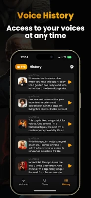 Navigating through your history of generated voices is a breeze. Save your favorite creations and share them with friends or colleagues. Whether itโs a funny parody or a serious speech, sharing your AI generated voices is just a tap away.