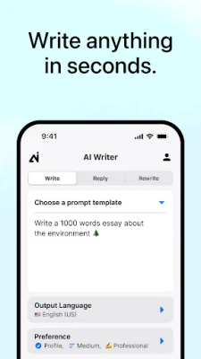 Key Features: • Instant Content: Write anything in seconds, overcoming writer's block! • Ready-to-Use Templates: Kickstart your writing journey effortlessly. • Comprehensive Use Cases: Get inspired for any writing scenario. • Multilingual Magic: Break language barriers with ease. • Smart Q&A: Find answers to all your questions. • Creativity Unleashed: Generate innovative ideas to make your writing shine.