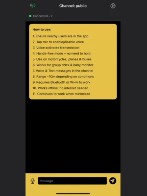 Lets you chat via voice or text without internet or servers.Just use Wi-Fi or Bluetooth for instant P2P communication.For motorcycle rides, boats, air flights and more!