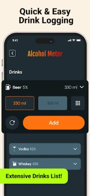 Comprehensive Drinks List: Ensure accurate promille calculations by accessing a list of common alcoholic beverages for easy selection, making it simpler to log and track your consumption.