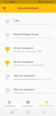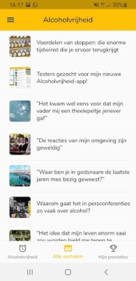 In deze 100% gratis app vind je mooie ervaringsverhalen, tips en leuke statistiekjes over jouw eigen reis naar alcoholvrijheid. Zo weet je hoe lang je al gestopt bent, hoeveel geld je hebt bespaard, hoeveel drankjes je hebt laten staan, hoeveel liters dat zijn en zelfs hoeveel katers je bespaard zijn gebleven sinds je bent gestopt. Hoe leuk is dat?
