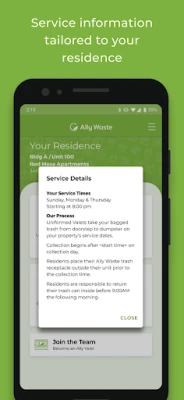 The Ally Waste Residential app offers information and reminders about your nightly trash collection. Learn more about trash collection guidelines and tips. View your property's unique service times and get in touch directly with Ally Waste for quick, comprehensive support.