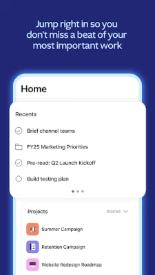 Set up different projects to bring your team’s work together in one shared space. Break the workload down into manageable tasks and give them a clear owner and due date. Choose a project view that suits your style—lists, kanban boards, or calendar.