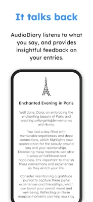 AudioDiary is a super-smart voice journal that effortlessly transforms your fleeting thoughts into lasting insights.