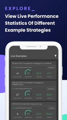 View live performance statistics of different example strategies and select your favorite ones with the click of a button.
