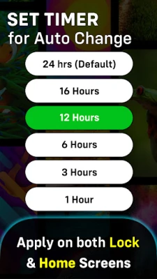 ⭐️ Set Timer - You can select from multiple timer options available. For e.g. 1 hour, 3 hours, 6 hours, 12 hours or 24 hours. You can change the timer duration anytime after activating the auto wallpaper changer by clicking on the Clock icon on top right corner of the app.