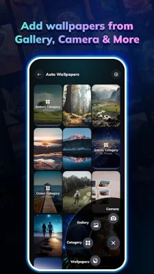 • Add Wallpaper: Choose a category, use your own gallery image, or capture image with the camera option to add as wallpaper on your Home Screen. Wallpapers change based on your selected time interval (e.g., every 5 minutes). You can also enable double-tap or unlock detection to change the wallpaper automatically.