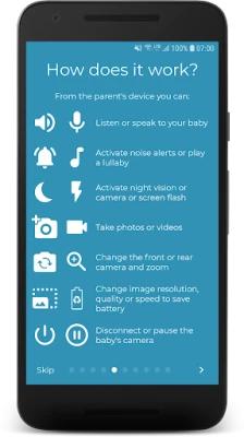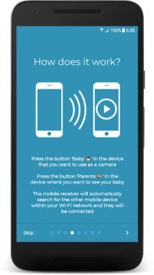 For BabyCam to work, it is necessary that the devices are connected on the same WiFi network or via WiFi Direct. The parent's device will connect to the baby's device easily and automatically.