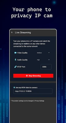 background video recorder, privacy app, secure video recorder, IP camera, home security, video recording, audio recording, video quality, SD, HD, UHD, FHD, 4K, Android, Android 15, live streaming, RTSP, schedule recording, free app.