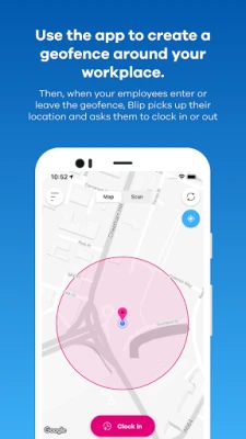 Use the app to create a geofence—a virtual boundary—around your workplace. Then, when your employees enter or leave the geofence, Blip picks up their location and asks them to clock in or out, helping you to know exactly where your staff have worked and how long for.
