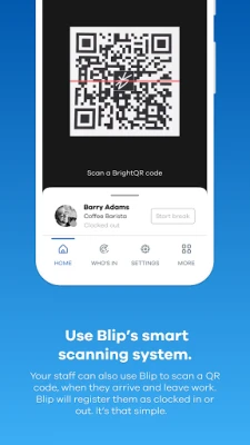 Your staff use Blip to scan a QR code—a type of barcode—when they arrive and leave work. Then, each time they scan the code, Blip will register them as clocked in or out. It’s that simple.