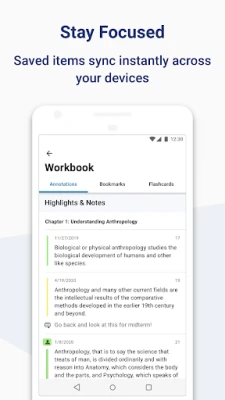 • Download books to your Android device for 100% offline reading. • Customize highlighters and add notes for a rich study experience. • Create flashcards with text and images to learn concepts faster. • Personalize font, font size, and background colors to make reading easier. • Listen to your books and learn on the go with Read Aloud. • Sync your current reading position and all your work across devices so you can easily pick up where you left off. • Built with accessibility in mind.