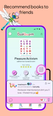 Share book recommendations. Send recommendations to friends and get them in return. Get notified whenever someone starts reading the book you recommended, and check out their review when they finish. All books recommended to you get saved to a bookshelf so you'll never lose them.