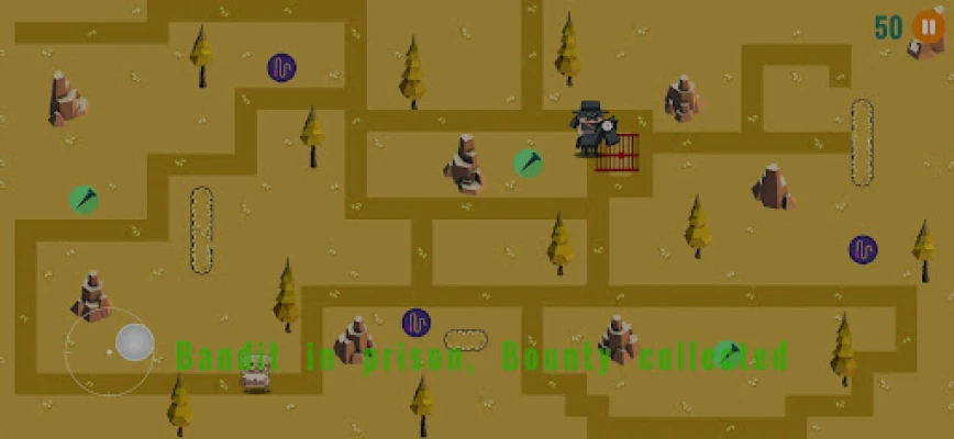 2D top-down bounty hunter sim. Collect bandits in area and deliver them to jail, mind the nails and whips in way. Points "will be" helpful to skip maps. Enjoy..