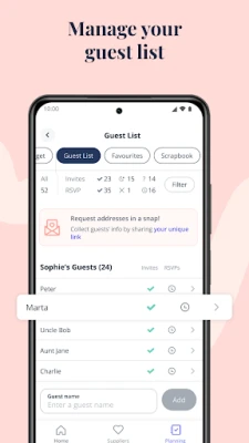 Link your account with your partner so you can plan your wedding on the app together. Assign tasks to each other using your shared Checklist, manage your Guest List together from separate devices, or even add another family member to help out with your wedding planning.