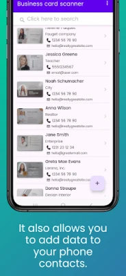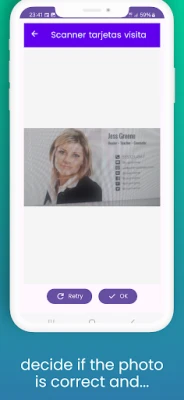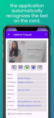 Scan business cards in seconds without typing. It is the card scanning application with the best recognition percentage thanks to Google's OCR engine and the application of artificial intelligence. The operation is very simple: it is only necessary to frame the card on the frame that appears on the phone, press the button to capture the photo and in less than a second all the data on the card will be automatically recognized and digitized, to be formatted in text fields.