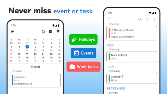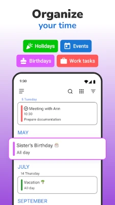 Set up events with ease, including repetitive reminders, event locations, and descriptions. Never miss a meeting or your gym session again, thanks to multiple reminder options provided by the calendar.