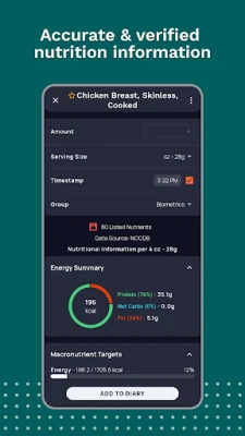 Food journal, verified macro & nutrition information, and a built-in nutritional target wizard to keep yourself accountable and reach your fitness, health or weight loss goals.