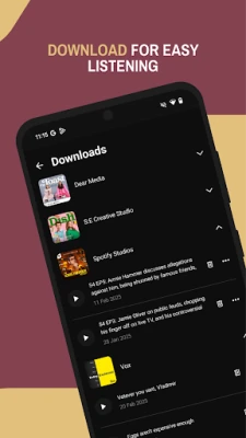 - Download: Download podcast episodes to listen later when you might not have a connection. You're in control, only download what you want, no more eating into your storage without you knowing. 💾