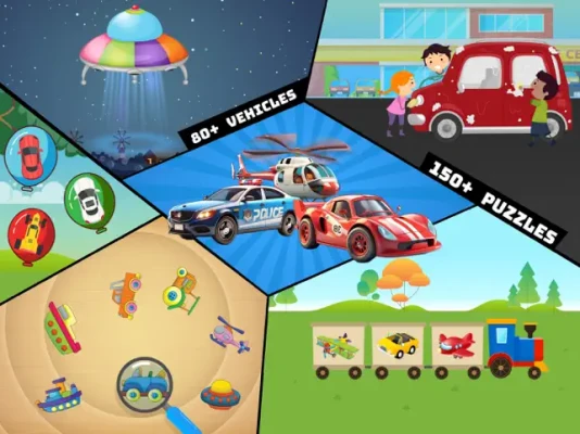 Cars puzzle is a fun and educational game for toddlers, specially young boys. Learn names and sounds, while playing 80 different transportation puzzles – some of them are planes, train, police car, school bus, truck, ship, space rocket, fire engine, hot air balloon and horse cart.