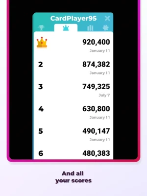 Your profile tracks all your achievements, from high scores to detailed game stats like total cards played, rows completed, and playtime. Tap on other players’ usernames in the leaderboard to see their stats too.
