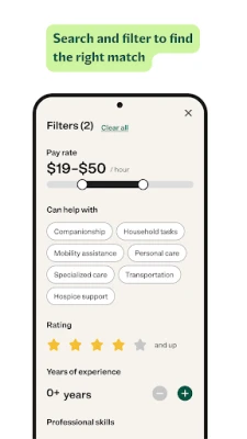 • Easily compare caregivers by experience, skills, hourly rate, ratings, and more