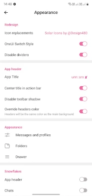 Appearance: You'll be able to fully modify drawer, center chat and app title like on IOS. Moreover, you can modify folder's design.