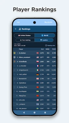 • Rankings - our global ranking and country rankings of all registered players! The order in the player rankings is determined by ELO rating, number of online games won, and points earned while solving puzzles. At any time you can check your exact position in the ranking in your country and worldwide!
