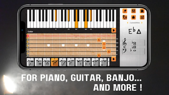 Press the keys on the piano or the frets on the guitar, and the application will recognize the chord and indicate its most appropriate notation. Also choose a chord from the dictionary to see all the positions that can be played on the guitar or banjo.