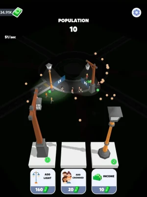 Bring light to the darkness with this new mobile game! In this unique game, you'll take on the role of the city's savior by buying and placing street lights throughout the city. As people pass by your lit streets, you'll earn money to continue brightening up the city. With challenging levels and a fun and engaging gameplay, this game is sure to keep you entertained for hours. Download now and start lighting up the city today!