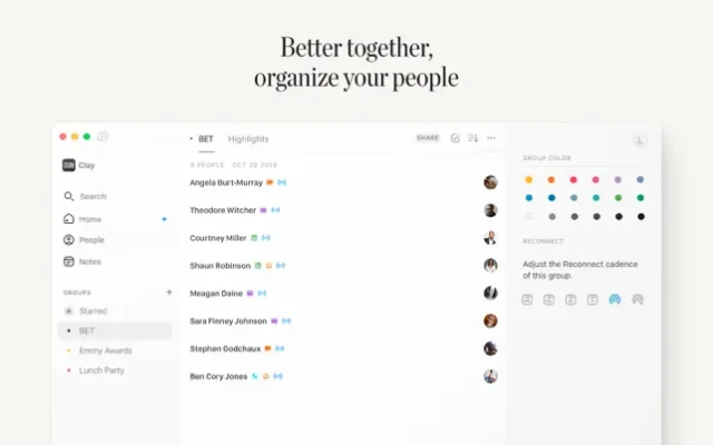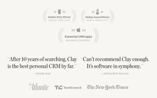 Discover, organize, and deepen all your personal and professional relationships with Clay, a beautiful and intuitive contacts app, lightweight CRM, and more.